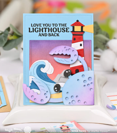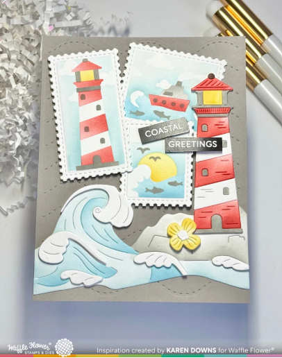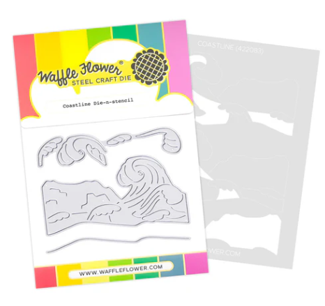 This set features a large wave and rock design that fits perfectly across a vertical A2 card (4.25” wide). It also includes a matching borderline die to create a sand layer that tucks right beneath the waves. We recommend cutting the main image from white cardstock and using the included stencil to quickly add color. Finish by layering the seafoam pieces—also cut from white cardstock—to make the waves pop!