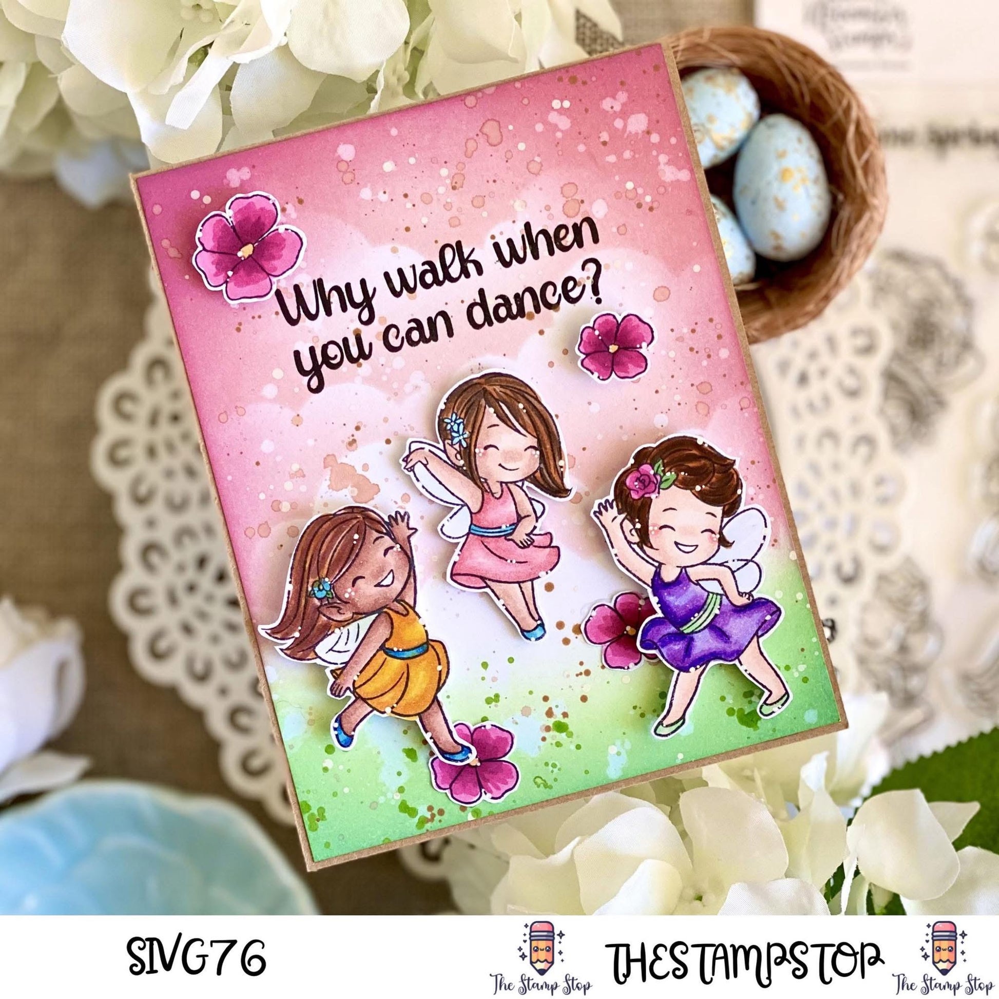 The Wees are making a grand return, and they're ready to twirl and dance with the arrival of Spring. This 6x8 set features 6 different Wees in playful poses, ready to frolic on the included tree branch. Add extra blossoms for even more Spring vibes! Includes three sentiments: