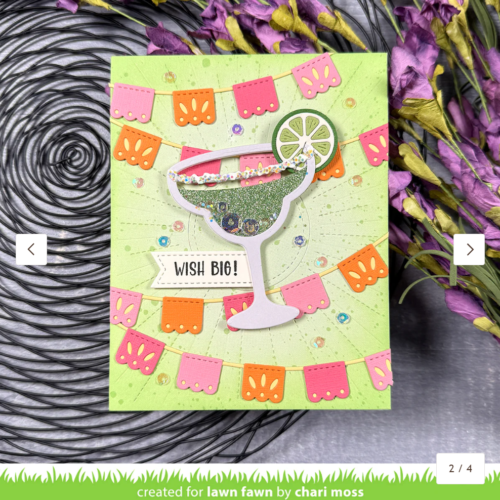 It’s time for a colorful fiesta! This set includes a curved border and additional fancy banners you can layer on top to change the look of your borderUse your favorite color of cardstock (shiny is super fun) or patterned paper for a unique creation to complement any occasion!