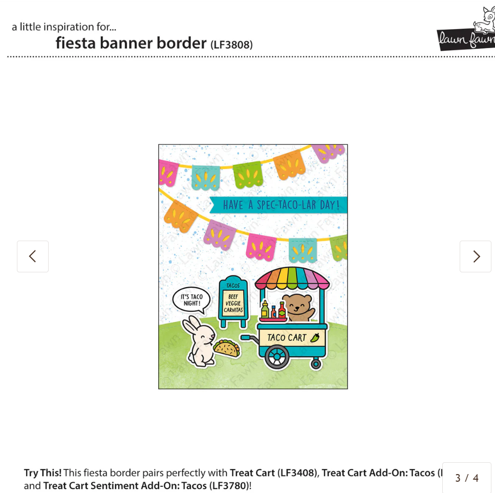 Coordinating set ideas: Line your card background with lots of colorful banners, and layer a big sentiment like Giant Let’s Celebrate, Giant Hooray, or Giant Outlined Gracias. Add banners to your Treat Cart Add-On: Tacos scene! Make assembling your banners a breeze by applying Double Sided Adhesive Sheets to the cardstock or patterned paper before die cutting.