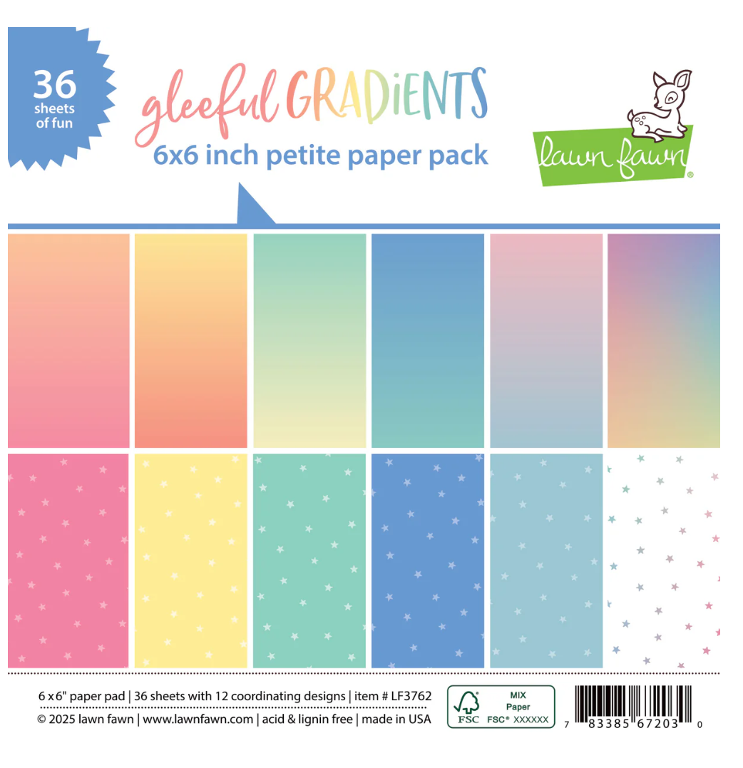 Give your cards and crafts a creative touch with this fun 6x6 pad! The Petite Paper Pack contains 36 sheets and features 12 coordinating patterns from the Gleeful Gradients.