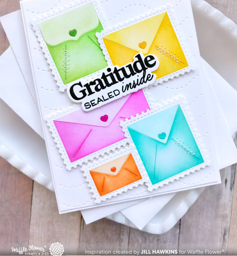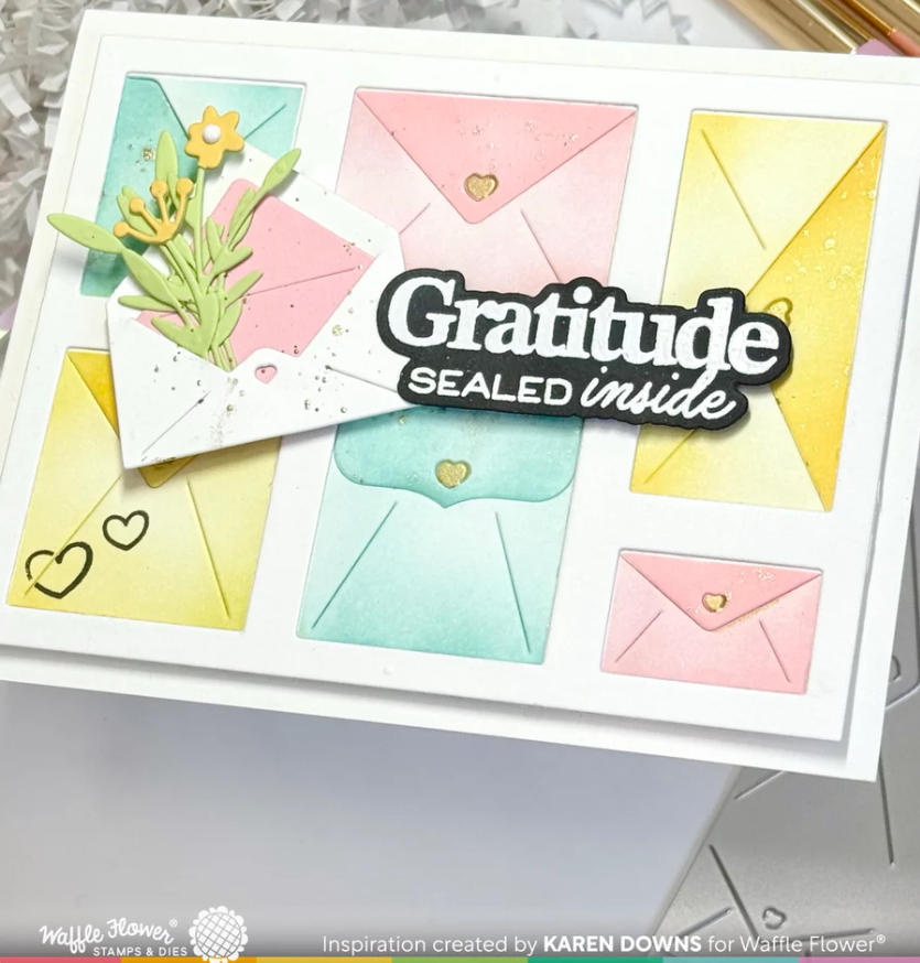 For extra shine, try adding glitter paste to the hearts! Pair it with the Postage Collage Envelope Die for a fully layered and detailed design!