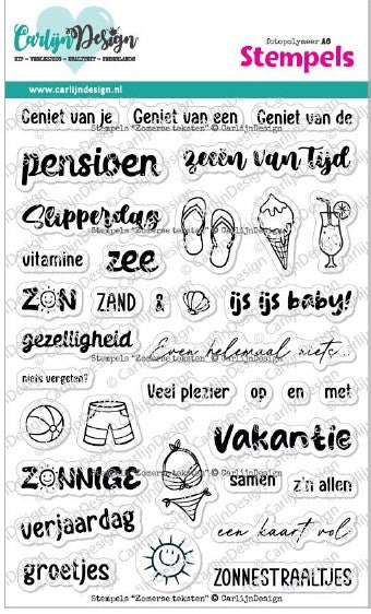 Stempels Zomerse teksten, A6 formaat stempels ontworpen door Carlijn. Allerlei leuke zomerse teksten die je met elkaar kunt combineren. Past ook leuk bij de Bier, wijn & cocktails stempels!