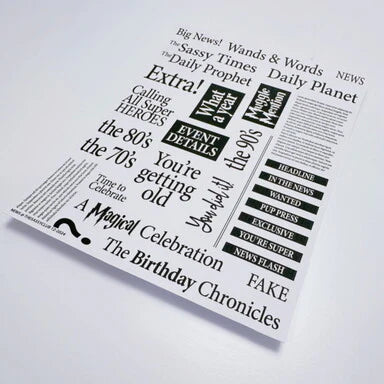 This set is made to coordinate with our news print die but can also be used on its own. Words on this set: Whats a year, event details, muggle mention, your getting old, a magical celebration, the birthday chronicles, wanted, your super, news flash, exclusive, in the news, call all super hero, daily planet, the sassy times, wands and words, big news, daily planet, the daily prophet, time to celebrate, the 80s, the 70s, the 90’s, your getting old, pup press, fake news, you did it. Word print in set is for a visual it does not actually say anything