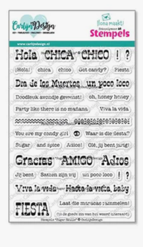 A6 photopolymer stamp set 'Sugar Skulls', with all sorts of fun and matching texts for the Sugar Skulls and Mexican and Spanish themes. Designed by Ilona Maakt!