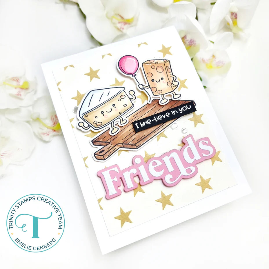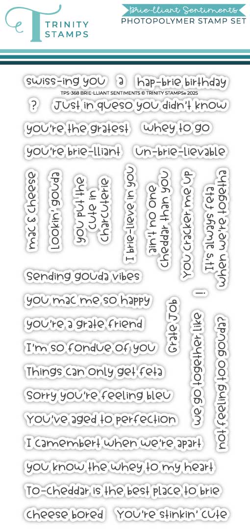 Add an extra sprinkle of cheesy fun to your project with these Brie-lliant Sentiments! Just in queso you didn't know, this 4"x8" sized stamp set is packed with 30 punny sentiments and two punctuation stamps. It's a grate value!