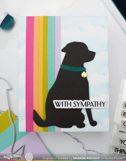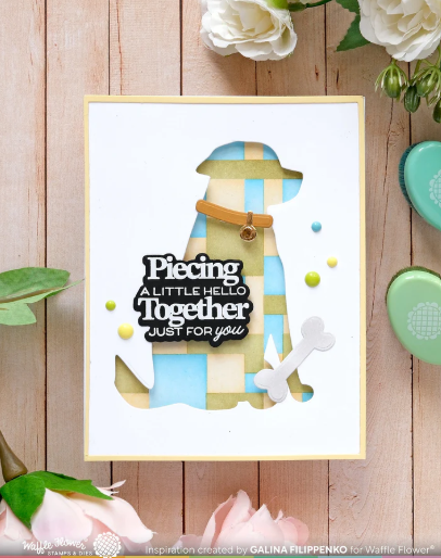The Dog Silhouette Die includes the outline of a dog, along with a bone, tennis ball, and a collar with a tag. You can use both the positive and negative diecuts for different looks. The collar and tag are separate pieces, so you can cut them from different materials. For even more fun, try combining the dog silhouette with your favorite shapes—like the circle shown here—for creative variations.