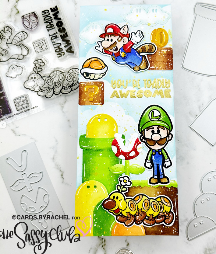 Works well with the plumber bros,super world,bad bros, dungeon squad, italian flyer, damsels and race track stamp sets and the Gameland die and switch die. The game over paperpad as well