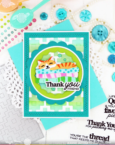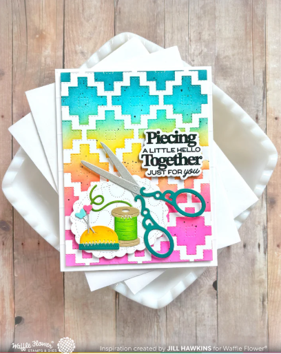 Unlike the other three texture dies in our May release, the Quilted Squares Texture Die features dashed cutlines and actually cuts out a panel that’s slightly smaller than A2—so no need to worry about trimming it to size. The coordinating stencil can be used on its own or layered with the texture die to enhance the pattern. This is a quick and easy pattern to use with big shape dies, such as the cat or dog silhouette dies.