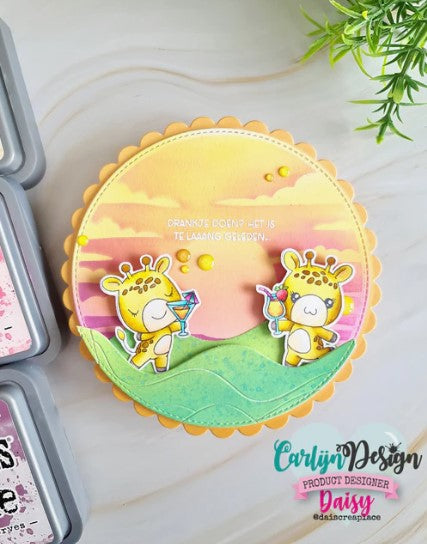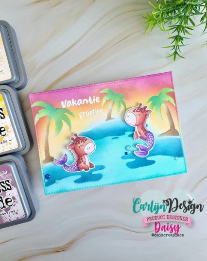 Stencils Summer scenes, designed by Daisy. A set of 3 rectangular stencils (A6) in a summer theme. A sunset and a moon, a beautiful radiant heart and nice palm trees with water. Nice to combine with the stamps Summer giraffes and cutting dies A6 Mermaid heart from DaisCreaPlace.