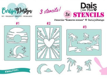 Stencils Zomerse scenes, ontworpen door Daisy. Een set van 3 rechthoekige stencils (A6) in zomers thema. Een zonsondergang en een maan, een prachtig stralend hart en leuke palmbomen met water. Leuk te combineren met de stempels Zomerse giraffen en snijmallen A6 Zeemeermin hart van DaisCreaPlace.
