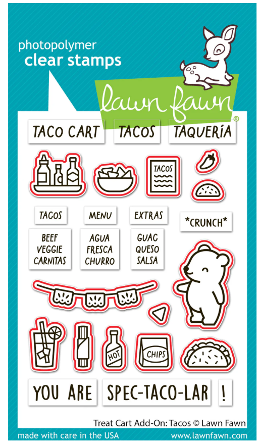 Let’s taco ‘bout this amazing Treat Cart add-on! Use this add-on to turn Treat Cart into a fiesta worthy taco cart! Complete with all the yummy treats, festive banner, adorable critter customer, and punny sentiments that are sure to guac your world! Spice up your card with the Treat Cart Sentiment Add-On: Tacos for some absolutely delicious puns!
